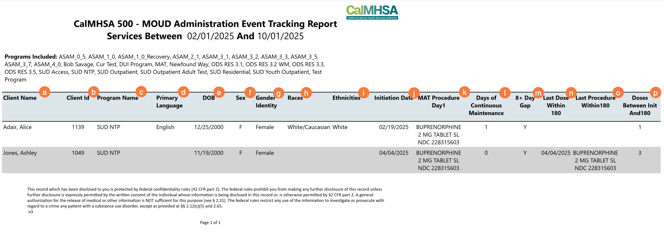 This report is designed to show MOUD administration events within a selected time range. The report supports tracking of continuous maintenance and indicates gaps within the first 180 days of MOUD treatment. The time range can be determined by the user through the Start Date and End Date filters. The report will display the client’s name, client id, primary language, date of birth, sex, gender identity, races, ethnicities, initiation date, the MAT service’s procedure code, the days of continuous maintenance, if there was a 8 days or more gap between services, the last dose given within 180 days, the procedure code of the last service within 180, and the amount of doses given between the initiation date and the 180 days.