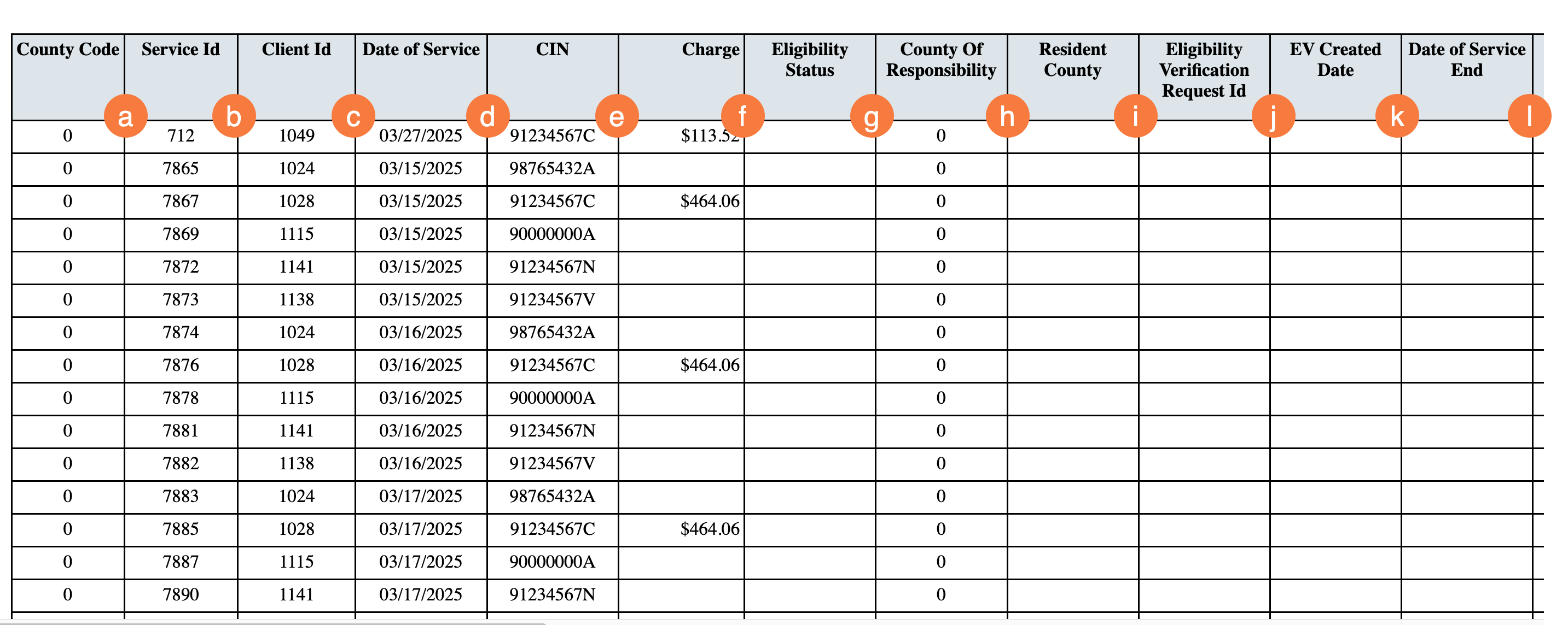 1. County Code: Displays the service record associated client’s county code number that is received when running an Insurance Eligibility check on the client