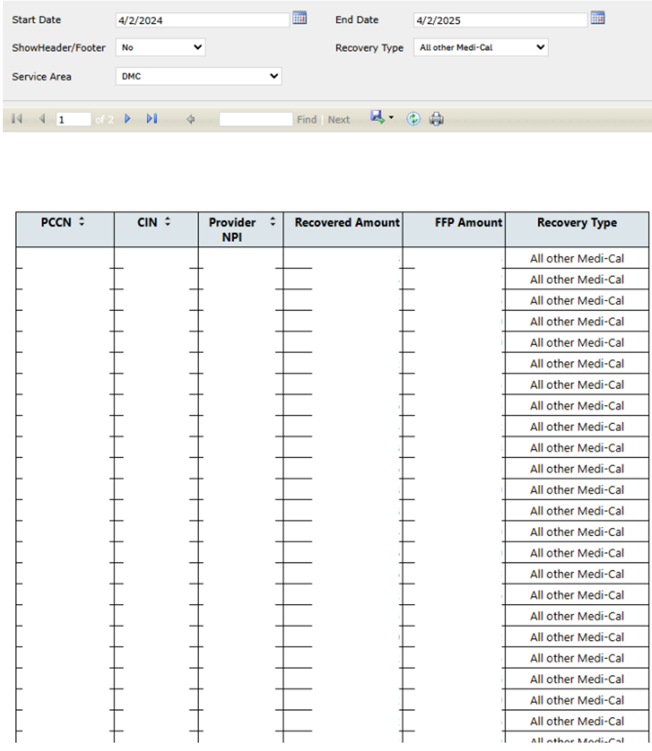 Recovery Type | Single Select Dropdown | N | A single select dropdown that allows users determine whether the column “Recovery Type” will display “42 CFR, section 438.608(d)” or “All other Medi-Cal”. | |