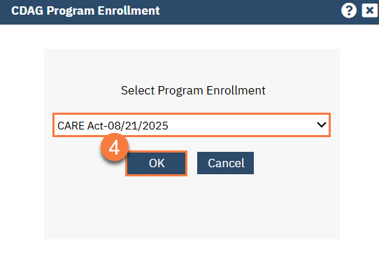 - Select the CARE Act program in the CDAG dropdown menu and click OK.