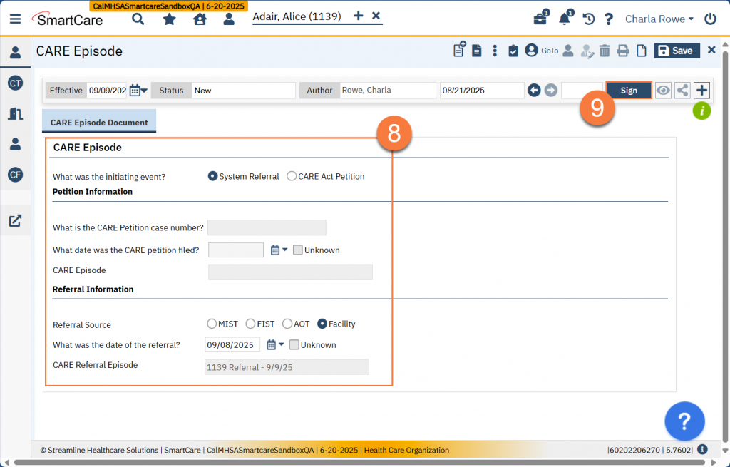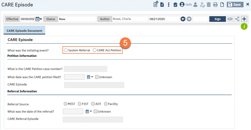 - Once you’ve confirmed the information, click Sign. This will complete the document and create the CARE Episode record in the system, which can be referenced by other documents in the system.