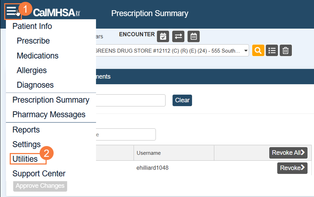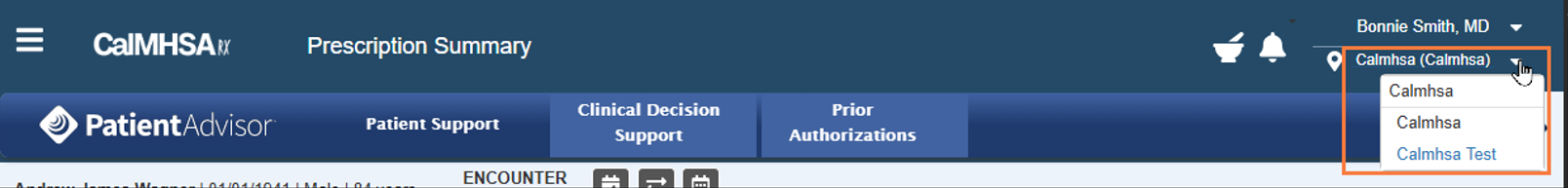 Locations can be found and changed at the top right of the CalMHSA Rx screen beneath your name.