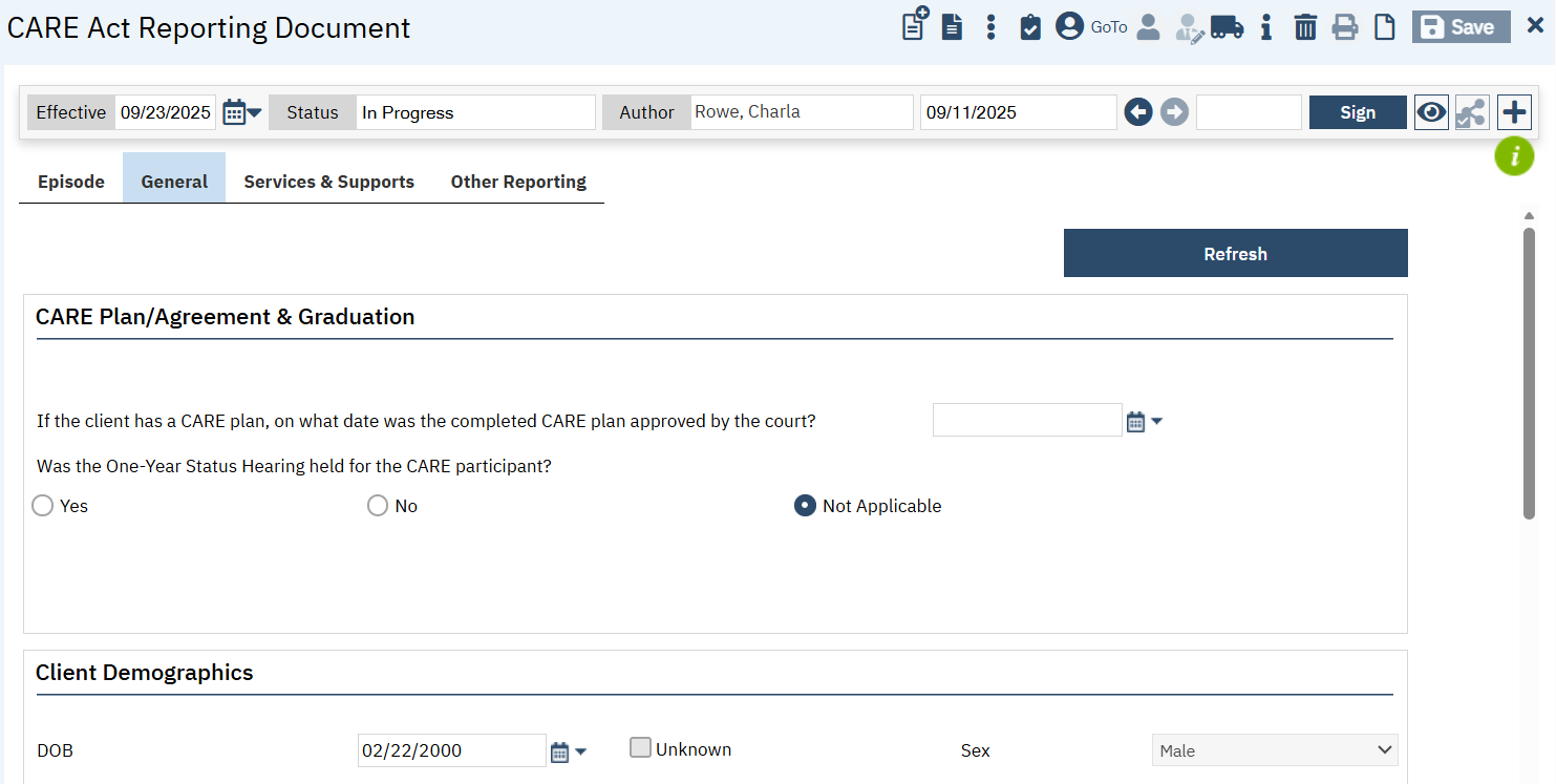 - Click through each tab and answer all questions shown. Note that on the General tab, some demographic fields pull from the Client Information screen while others do not. There is a Refresh button to re-initialize data from the Client Information screen if you’ve made updates on the Client Information screen since creating or saving this document.