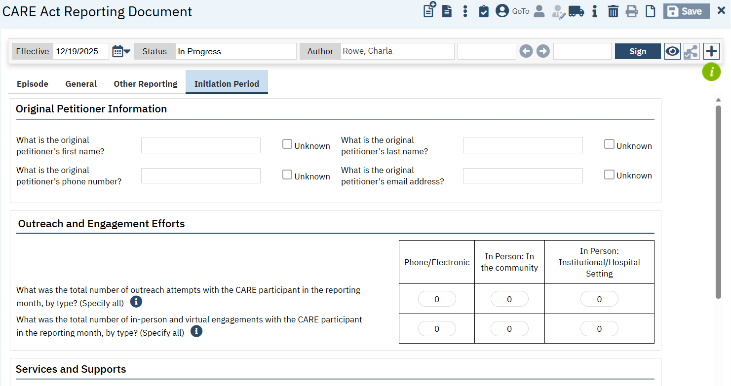 This tab is only visible when the CARE Phase is Initiation Period. This has information about the petitioner, outreach and engagement efforts, and services and supports provided during the initiation period.