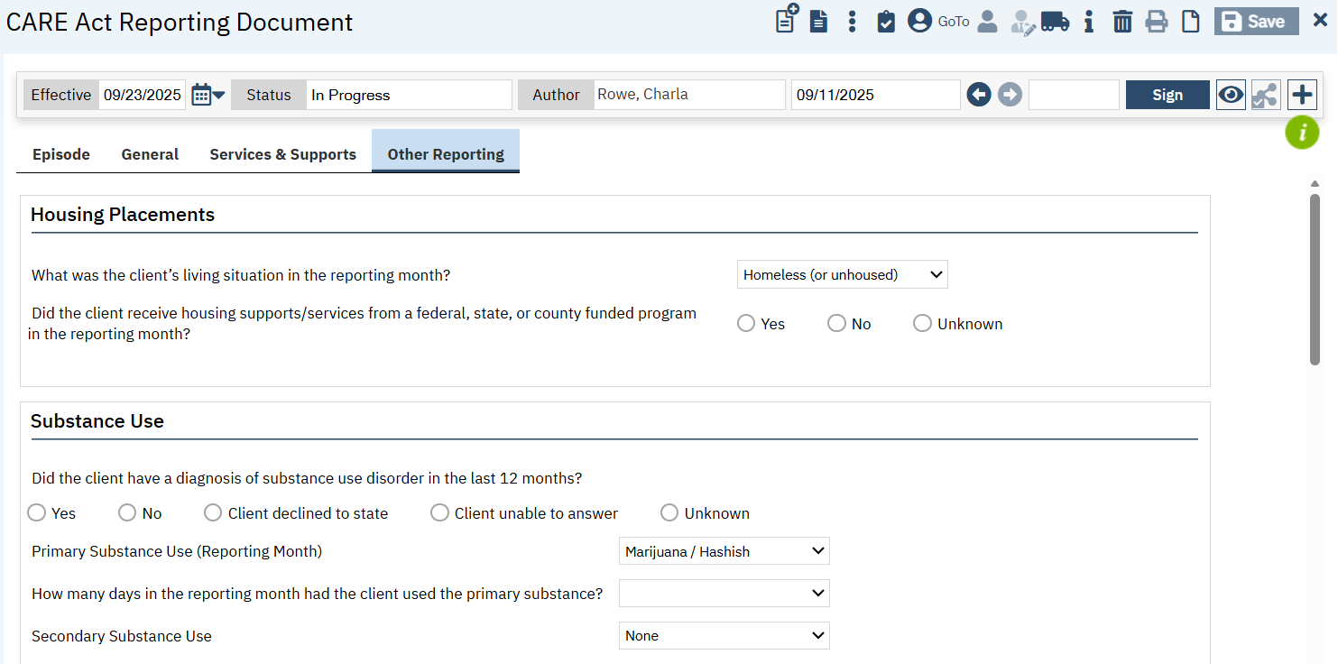 - In the Episode section, select the CARE Episode from the dropdown. This will pull from the CARE Episode documents that exist for this client, so if you’re not seeing any available, make sure to complete the CARE Episode document first.