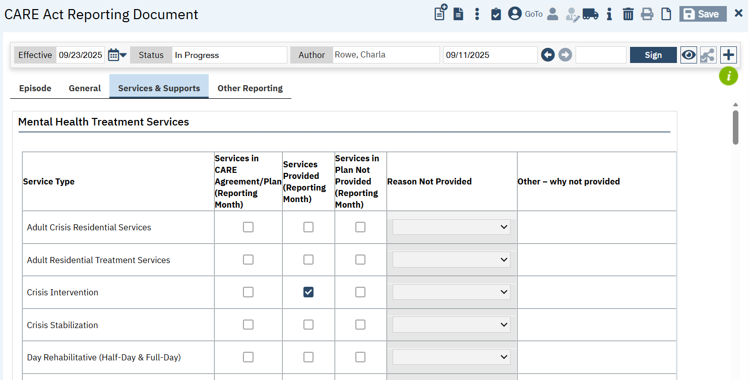 This tab is visible for the Active CARE Phase. This tab will take a while to load because the system is actively pulling data about services provided to the client in the reporting period and auto-populating what it can. It’s also pulling in data from the CARE Plan/Agreement document.