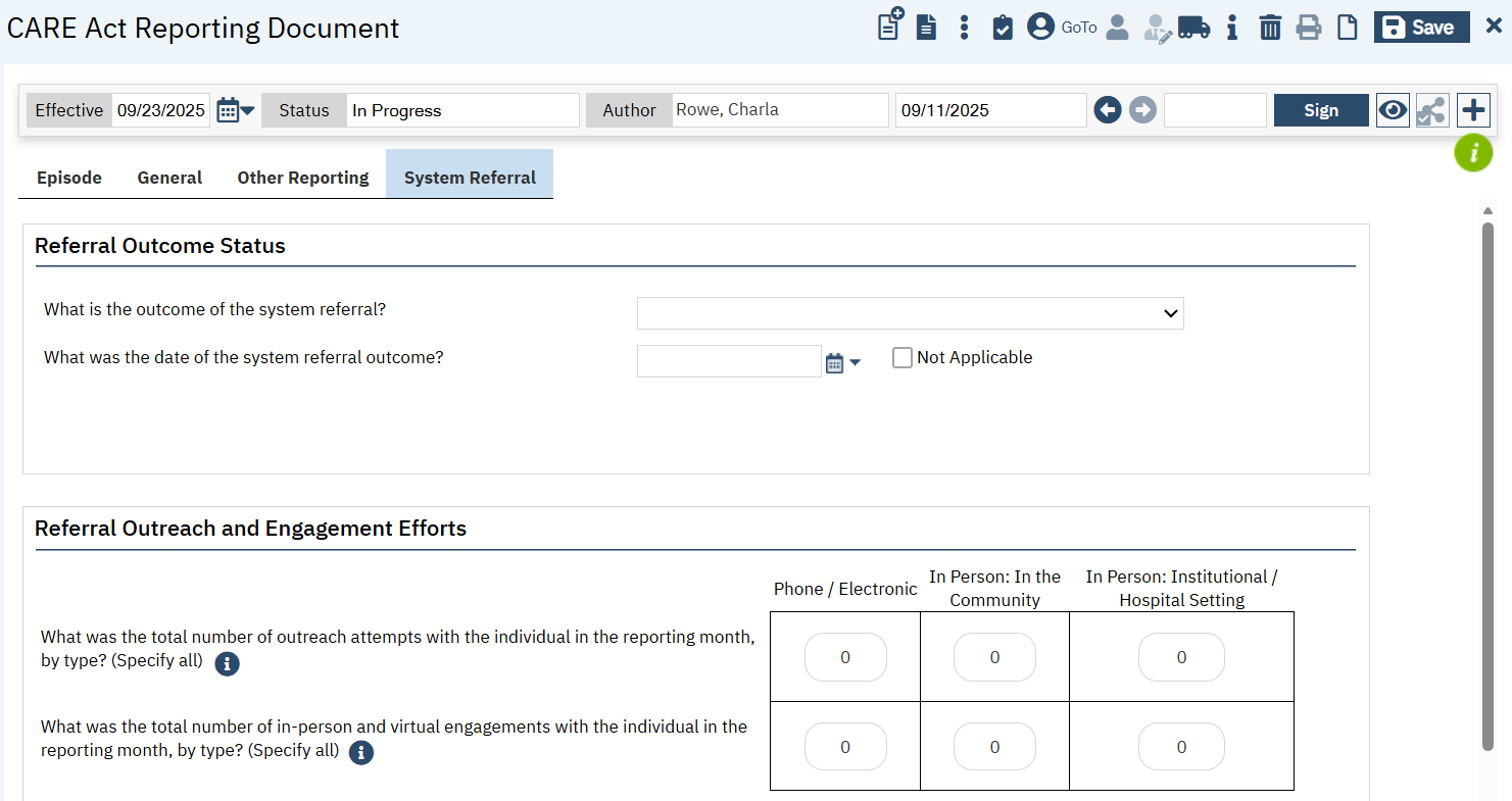 This tab is only visible when the CARE Phase is System Referral. It includes information about the outcome of the referral, outreach and engagement efforts, and services and supports provided during the referral period.