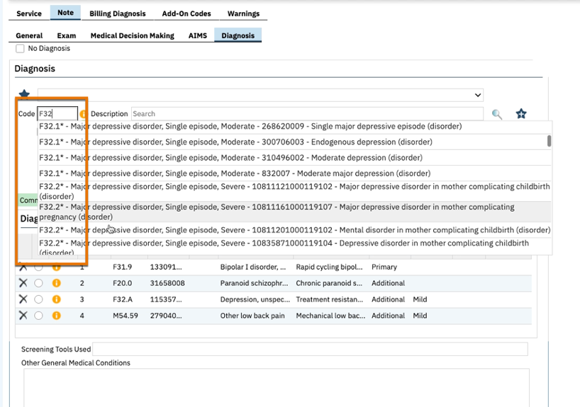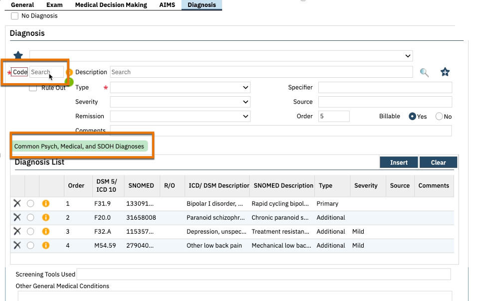We have created a quick guide of common psychiatric, medical and SDOH codes. These can be found within the EHR: ( Common Diagnoses Codes (PDF) )