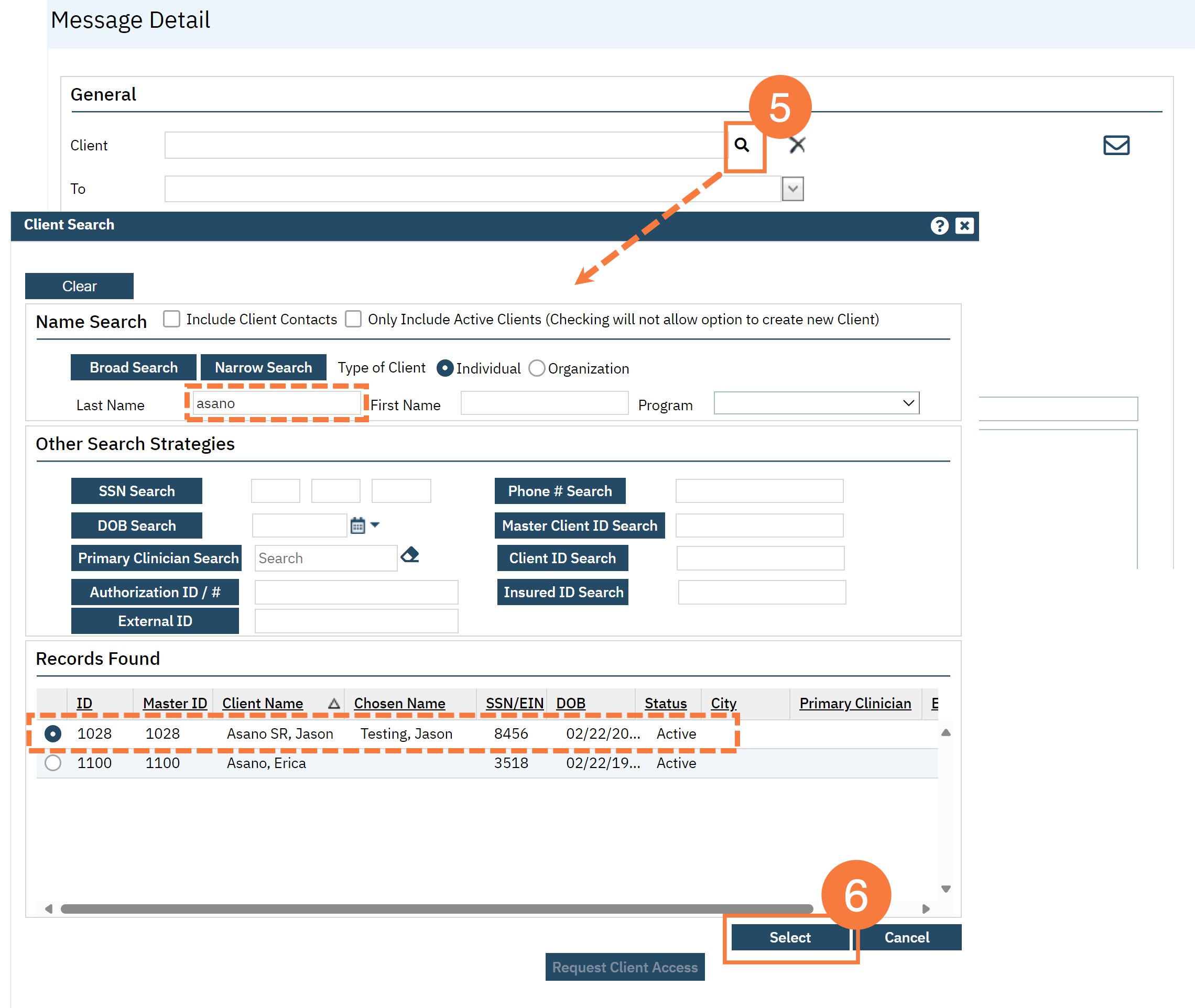 - The Message Detail screen will open. Click the Magnifying Glass icon to search for the client.