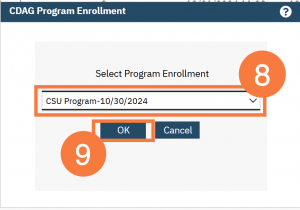 - The CDAG Program Enrollment window will pop up. Select the correct Program Enrollment from the available options.