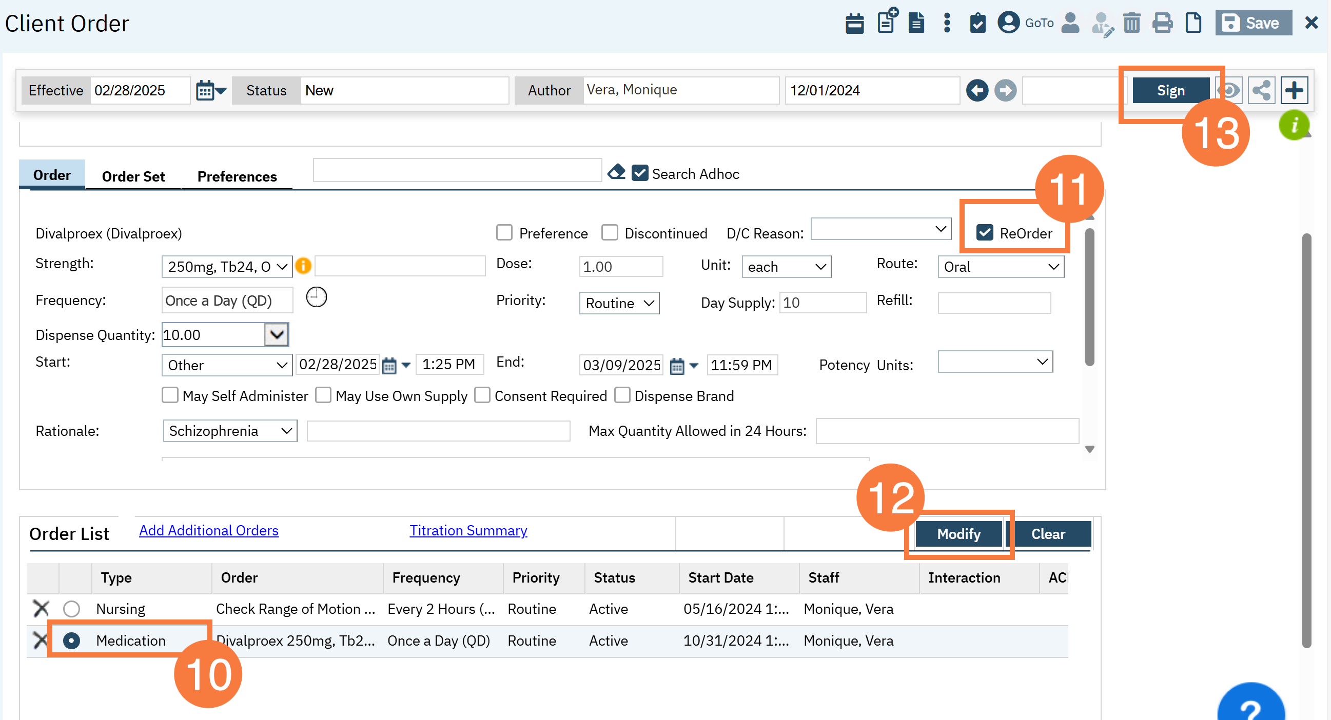 - Click the ReOrder checkmark, this will generate an order with the current date and end date (based on the Day Supply). The dispense quantity may also adjust based on the frequency and the day supply. Otherwise, the rest of the parent order’s information will remain the same.