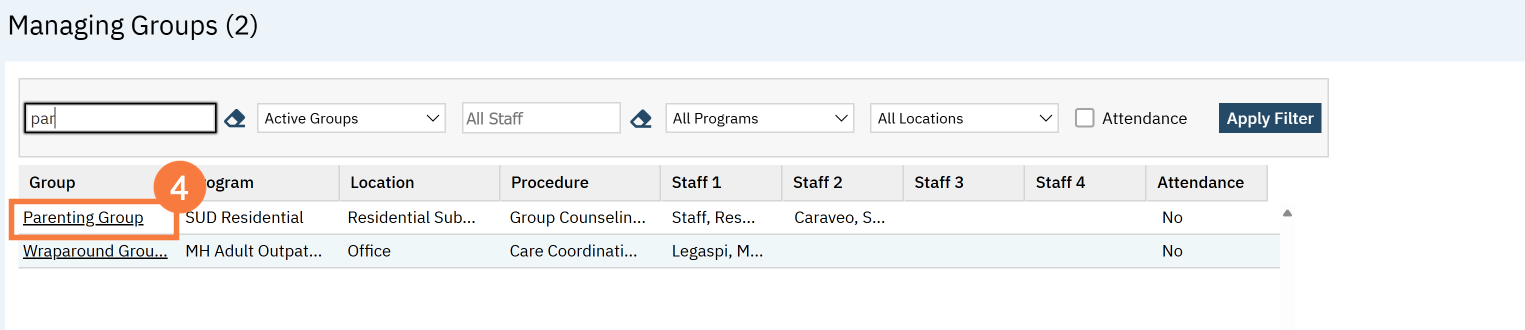- This takes you to the Managing Groups list page. Filter as appropriate and click the hyperlinked group name.