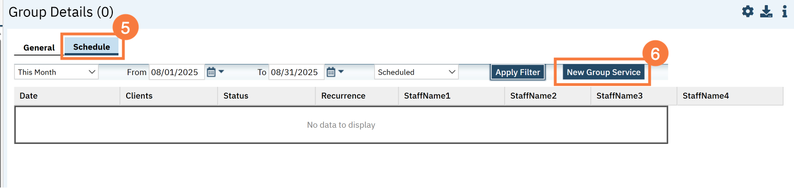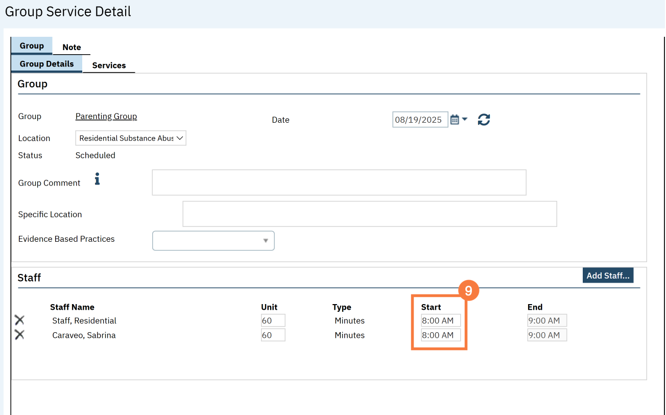 - This takes you to the Group Service Detail screen. Confirm the group information. The staff’s start time for both facilitators will default to the start time; update if necessary.