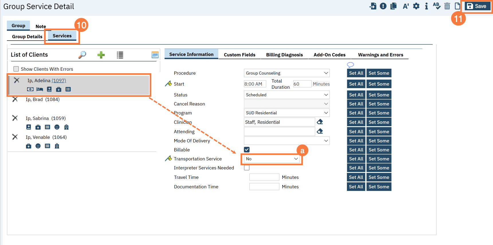 - If any of the clients require transportation, make sure to enter that by clicking on the client’s name and entering their specific information in the service information section