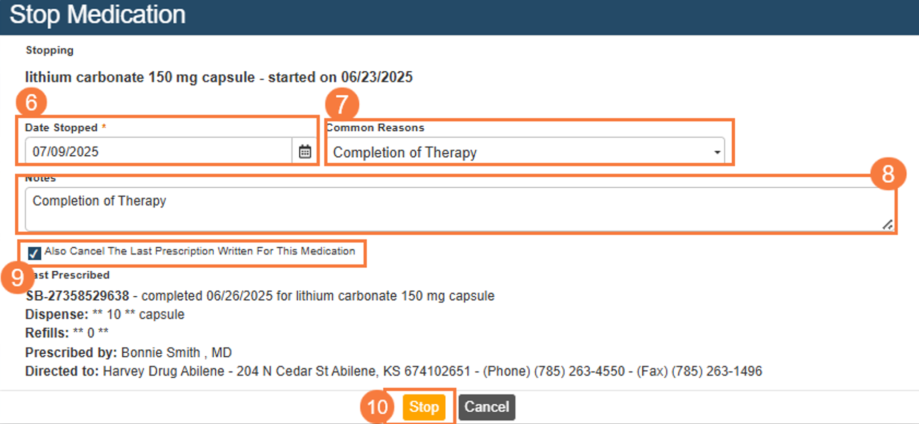 Important: During the process of stopping a prescription, there is a check box that can be selected to also cancel the last order for this prescription. This will send a cancellation/discontinuation notice to the pharmacy.