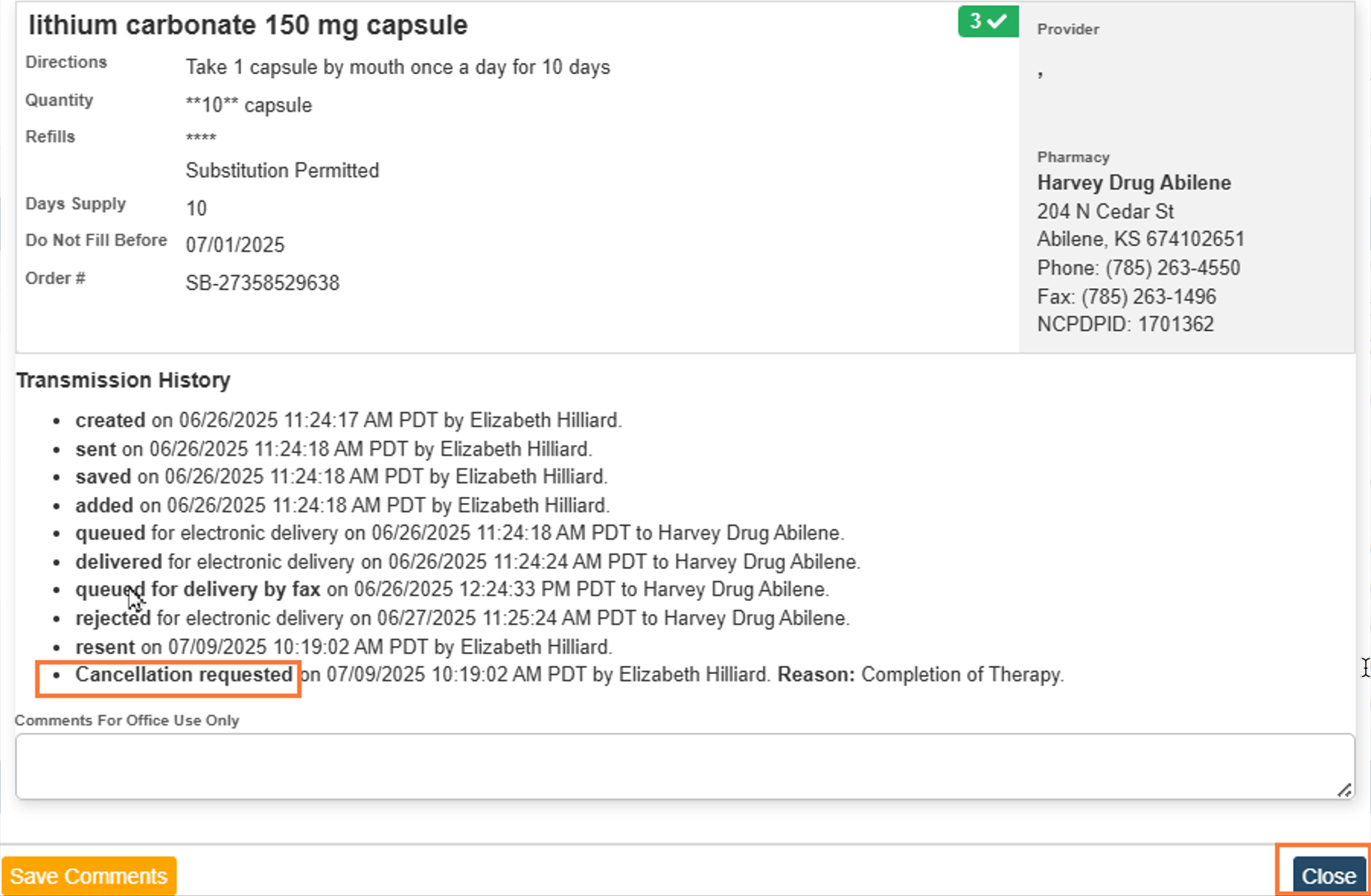 A popup window should appear showing the selected prescription. At the bottom you will find the transmission history. You should see Cancellation requested. Another message line will appear after this one stating if cancellation request was successful or not. This screenshot was taken in a testing environment so that message does not appear. Select Close, to close this screen