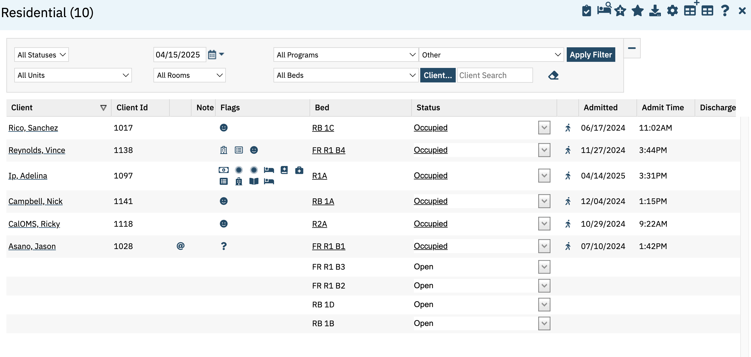 - Open: Filter to this status to view all beds that are actively open for the selected day. These are the beds you can admit a new patient.