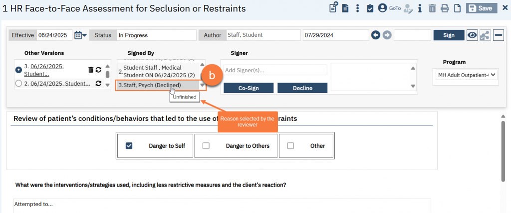 If the reviewer declines to sign the document, they system will create a new version of the document and reassign the document to you with an “In Progress” status. To see the reasons for the reviewer declining, hover over their name in the “Signed” section.