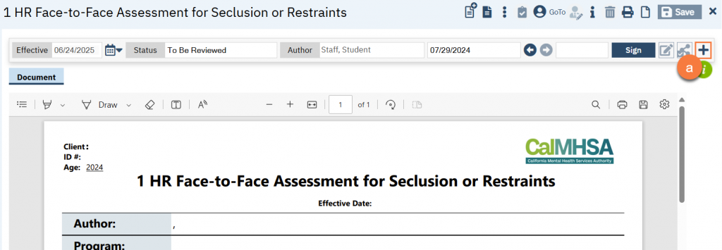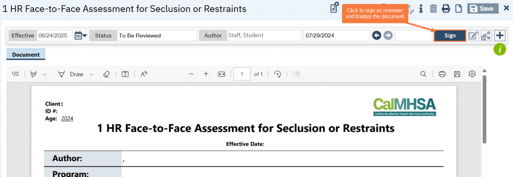If you are ok with the document as-is, simply sign the document (click “Sign”). This will finalize the document. Please keep in mind that if the document is “To Be Reviewed”, the document will not be considered “complete”, nor will the service note move forward in the billing process, until you have signed the document.