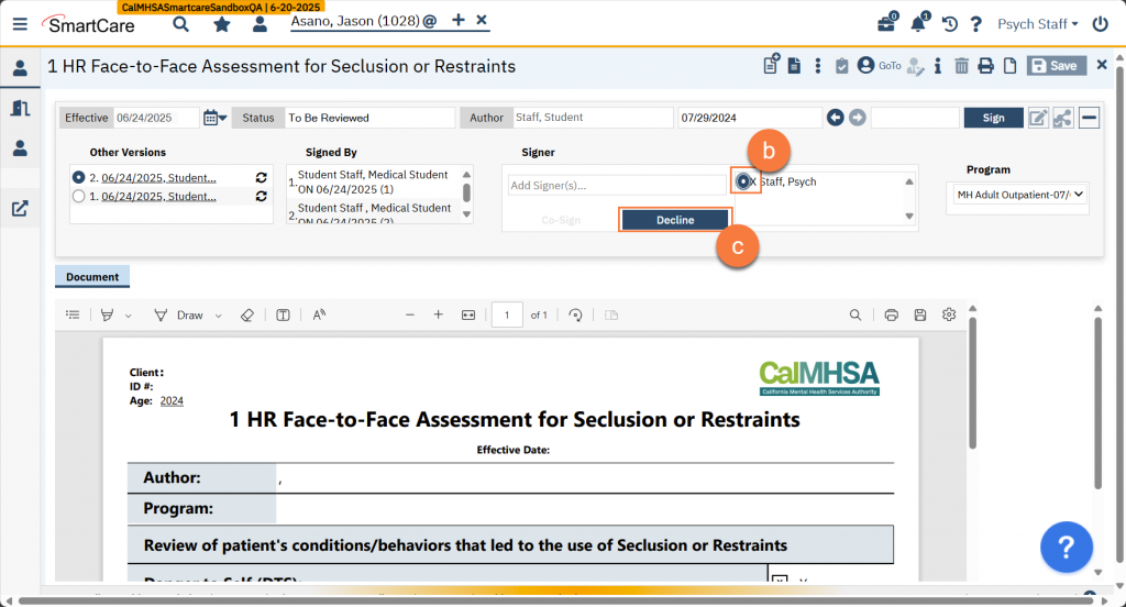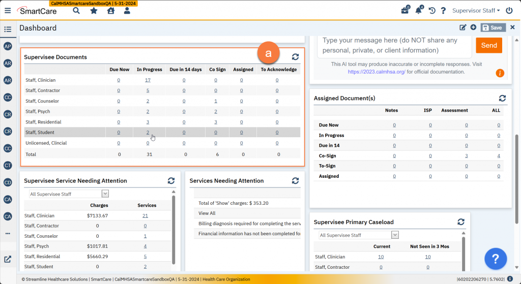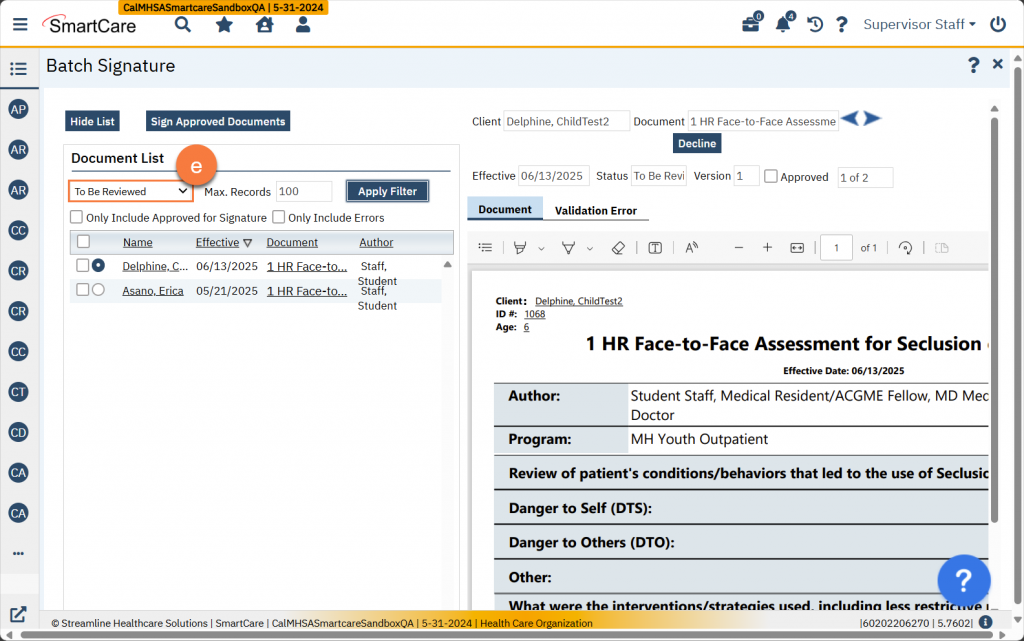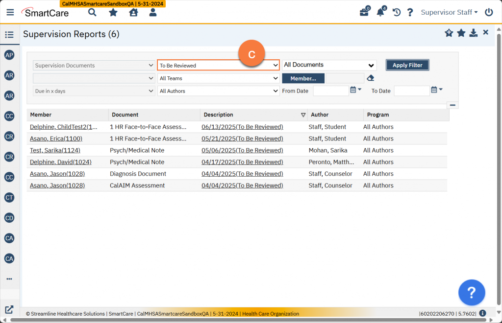 If your county has turned on the reviewer process, you may be selected as a reviewer upon a trainee signing a document or service note. Documents that are “To Be Reviewed” do not have their own row in the widgets (e.g. Assigned Documents, Supervisee Documents). However, in the Supervisee Documents widgets, they will be included in the “In Progress” list (a). Clicking on this link will take you to the Supervision Reports list page. You can see on this list page that the description includes “To Be Reviewed” (b). You can also filter this list page to include all items that are marked “To Be Reviewed” (c)