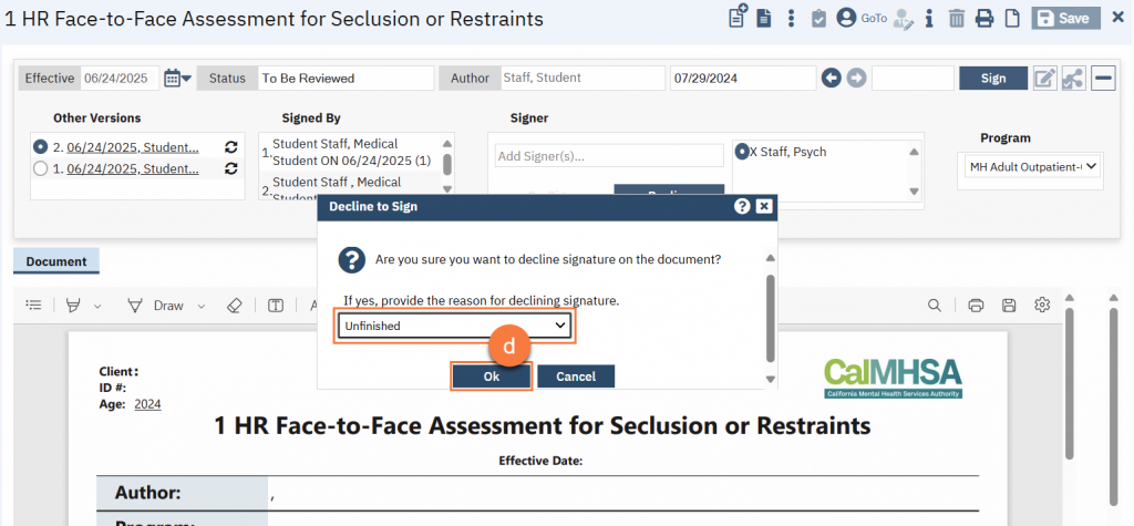 - This will bring up a popup window (if your system administrator has set up documentation of declining to sign). Select the reason you are declining to sign and click OK. The reasons in the dropdown menu are managed by your system administrator. If you select “other”, a text field will appear allowing you to enter the detailed reason for declining to sign.