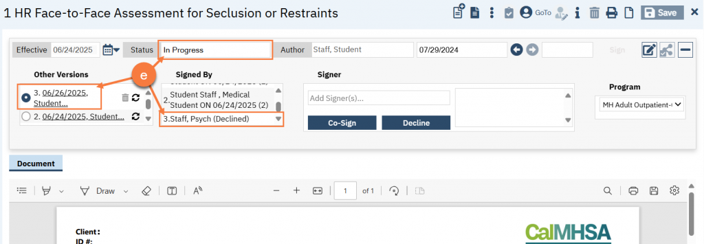 - This will create a new version of the document, put it in status “In Progress”, and show that you declined to sign.