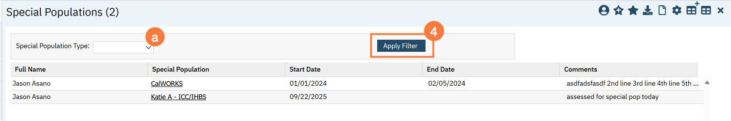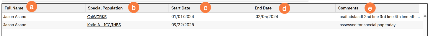 This list page shows all special population records associated with this client. This will only include non-SUD special populations, as SUD special populations has their own list page.