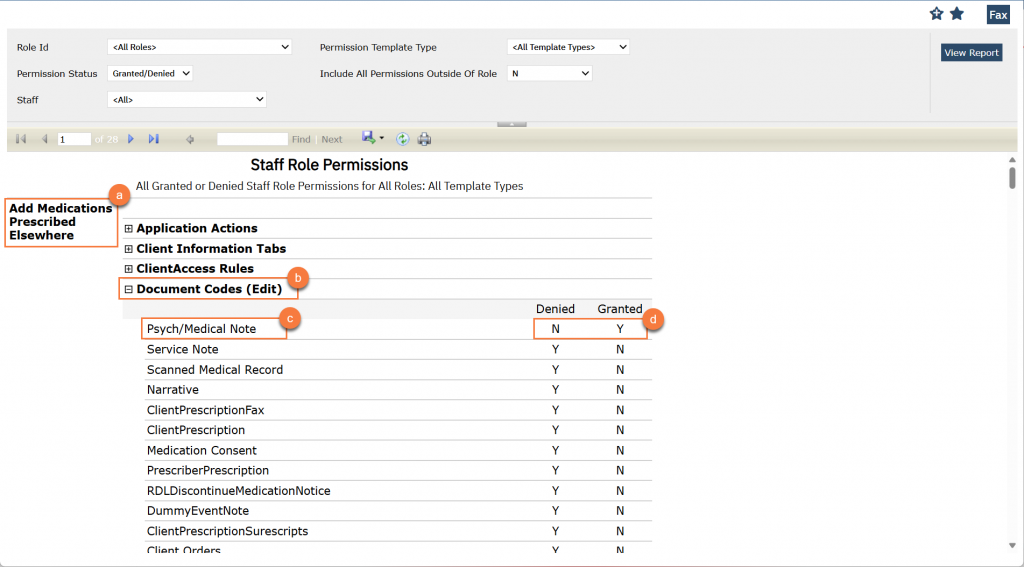 This report is designed to show what permissions are granted to which user roles. CalMHSA recommends using this report with specific filters to see a full list of all permission statuses (granted/denied) for all user roles. See Permissions Matrix Report for more information.